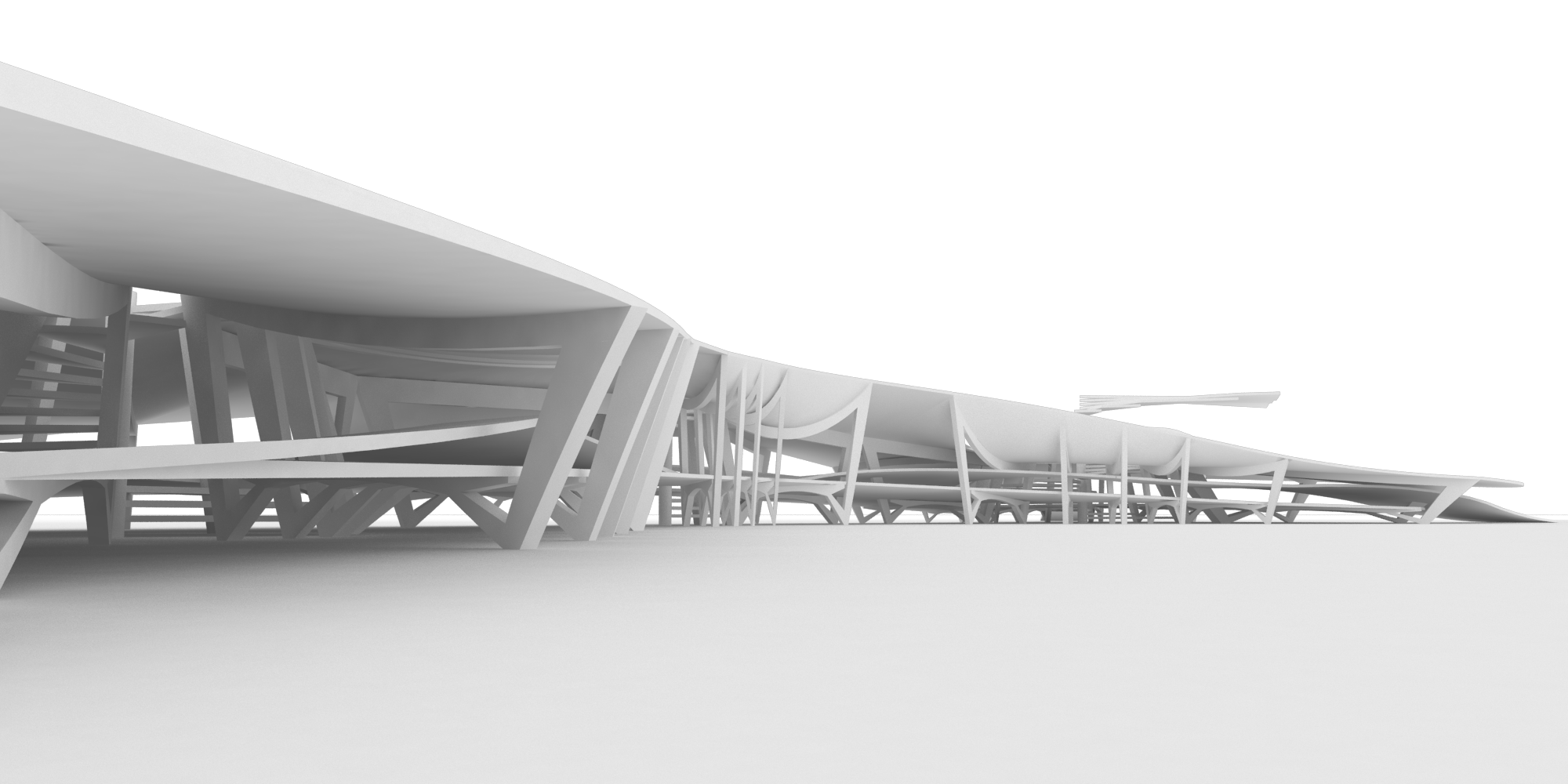 The base curves of the Ibirapuera’s Marquise were duplicated creating the height curve of the future museum. Rio’s Porticos were populated along those curves; With the placement of Bahia’s staircase, a centrality was created and so, all the porticos were directed to this new center. This stair will function as a collection of vertical spaces, since each step is the size of a room; Based on random parametric position, it was created a second Bahia’s staircase. Those stairs were connected to each other; A third staircase was randomly positioned; The sizes and the heights of the staircases were randomly changed, until the values were acceptable according to the analysis of the architect; The position, the sizes and the heights of the staircases were randomly changed; A fourth, a fifth and a sixth staircase were randomly positioned; The position, the sizes and the heights of the staircases were randomly changed, until the values were acceptable according to the analysis of the architect, and the number of porticos have been changed; The number of staircases returned to three and the height of the side curves was increased; A surface was created on top of the building; An intermediate passage was created between the roof and the ground floor of the museum; The steps of the staircase’s angle became the same angle as Bahia’s staircase; A surface was created on top of the building; The top beam of the porticos were all curved based on a intermediate curve of the staircase height and the external curve height; An intermediate passage was created between the roof and the ground floor of the museum; and The surfaces were smoothed.