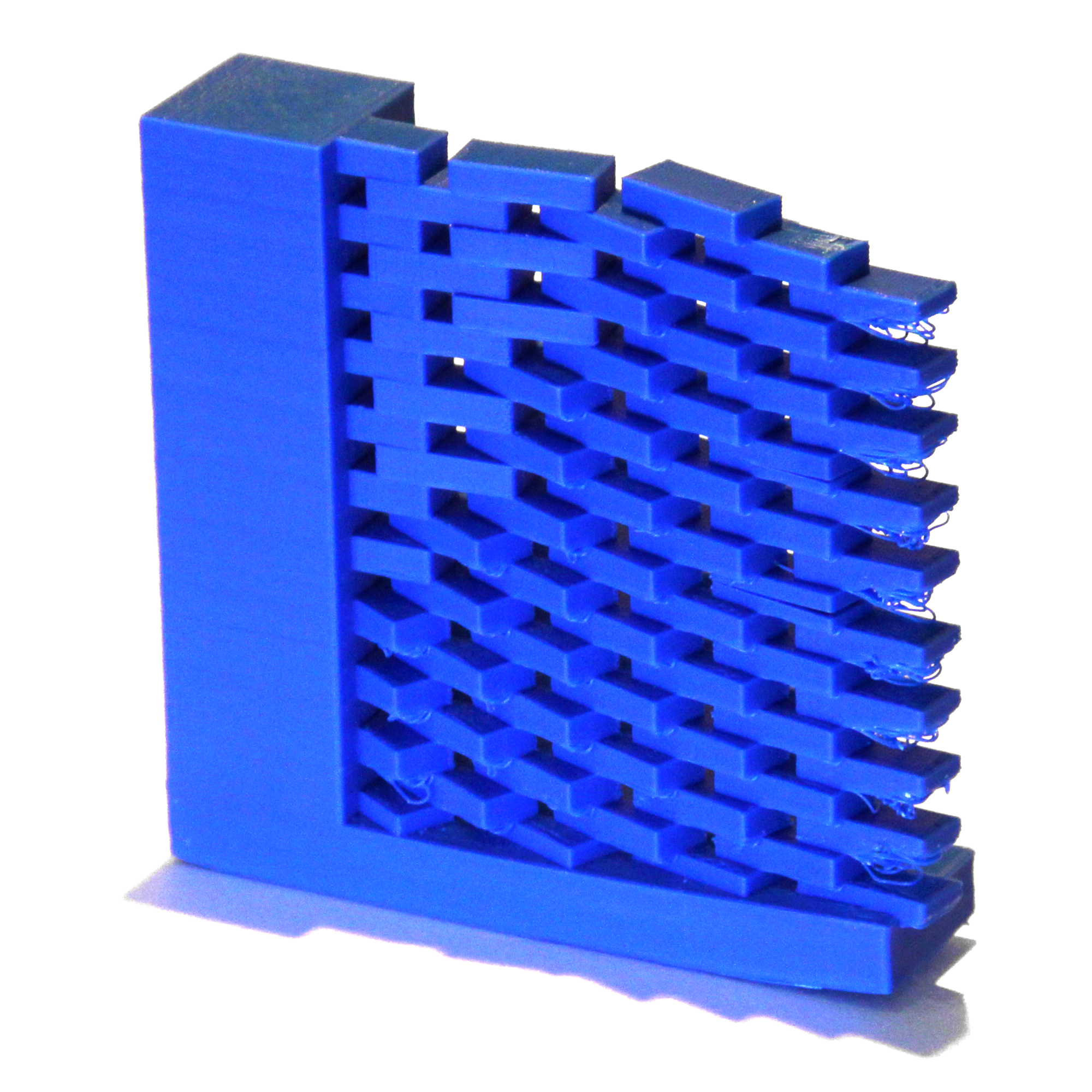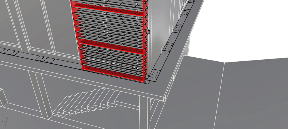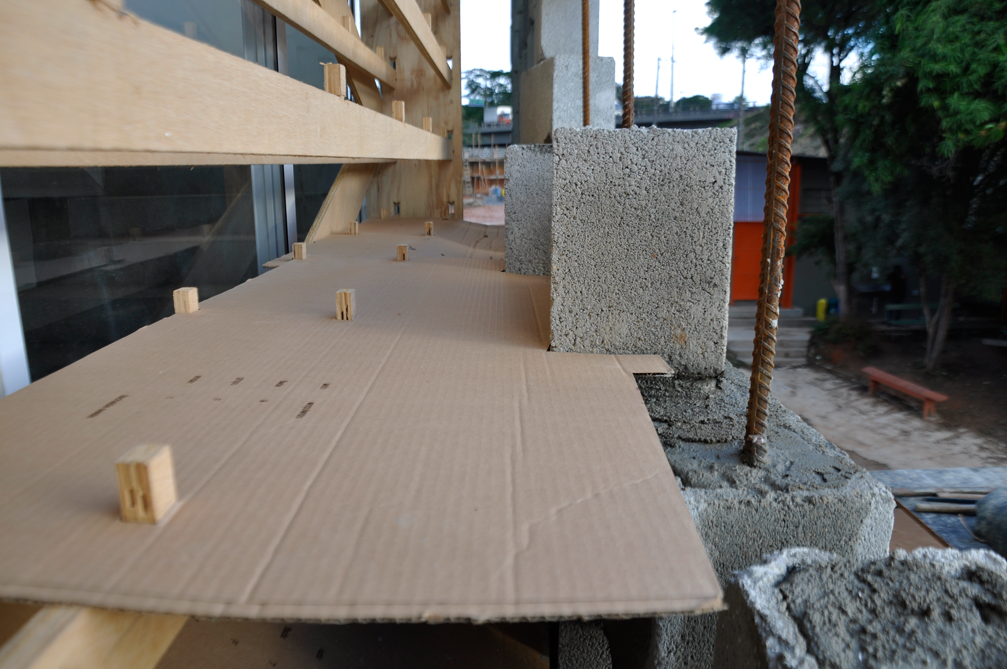 The arrangement of these bricks was made parametrically. By the low budget, a robotic arm was out of question thus was thought a method to dispose the bricks through cardboard guides cut in laser cutters, whose profile was obtained parametrically from the virtual model. These guides were arranged along each row of bricks, supported by a shelf of wood cut on a CNC Router. Later the bricks would be layered by the traditional method by a traditional bricklayer, the cardboard guides would be discarded and the bookshelf would be moved to the side to be made a new section of the wall.