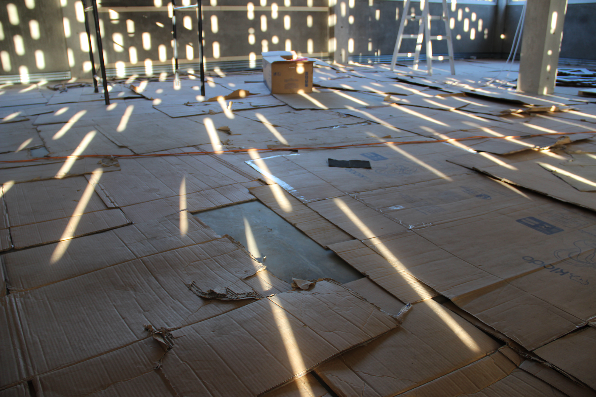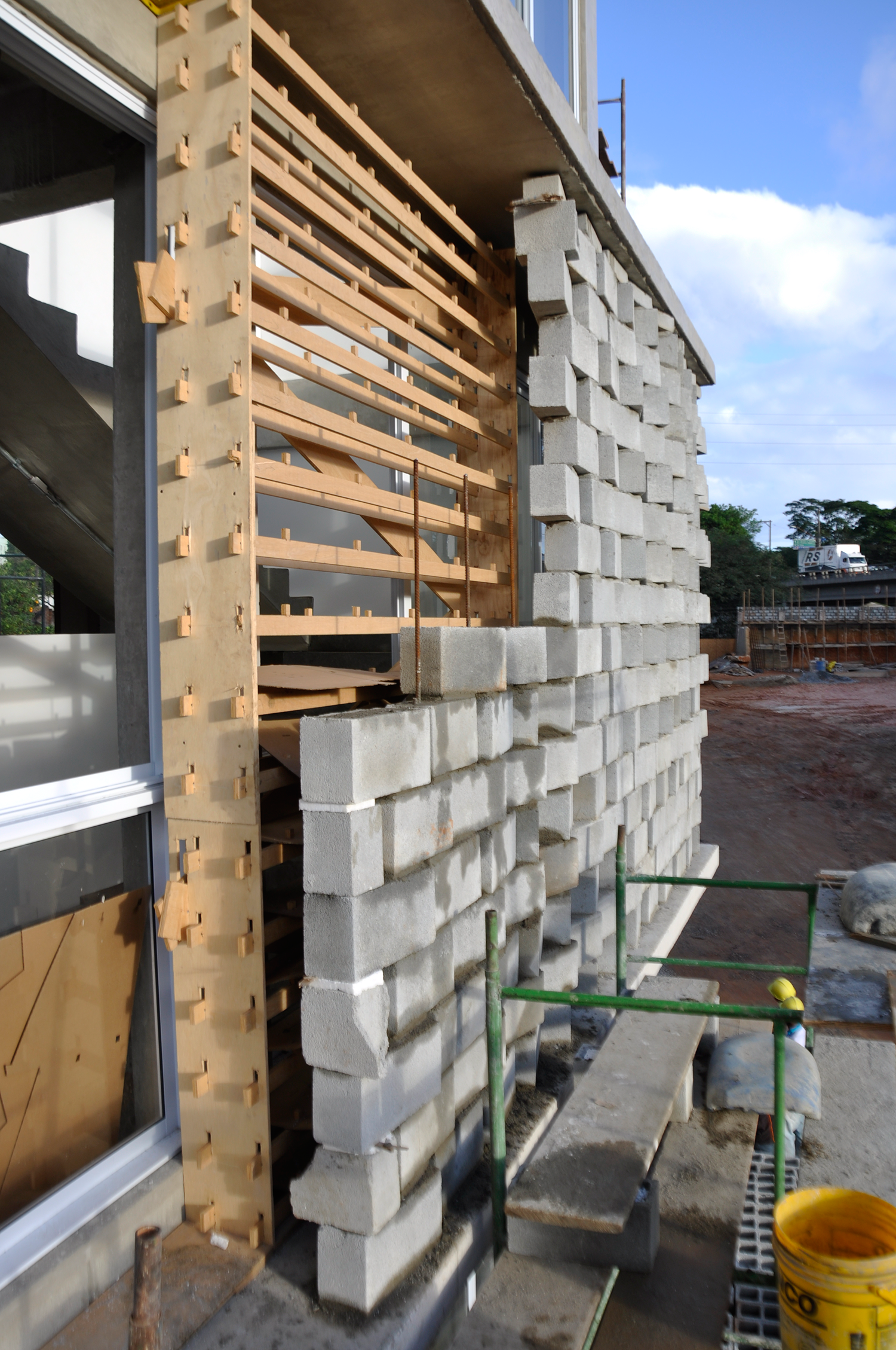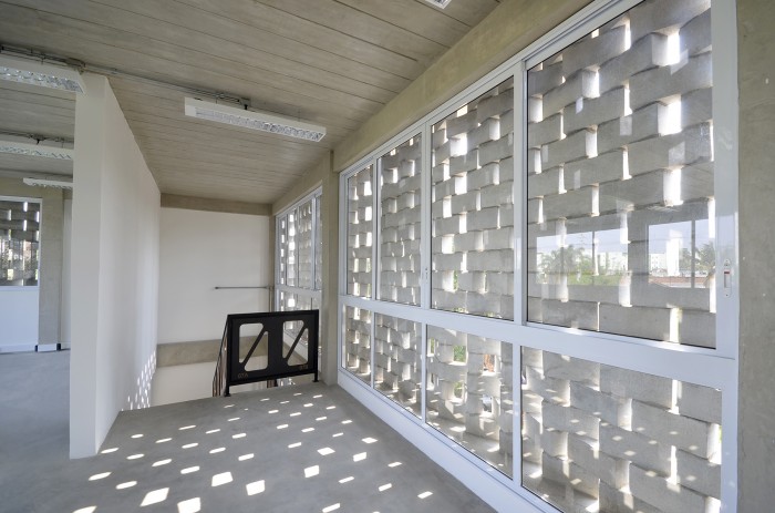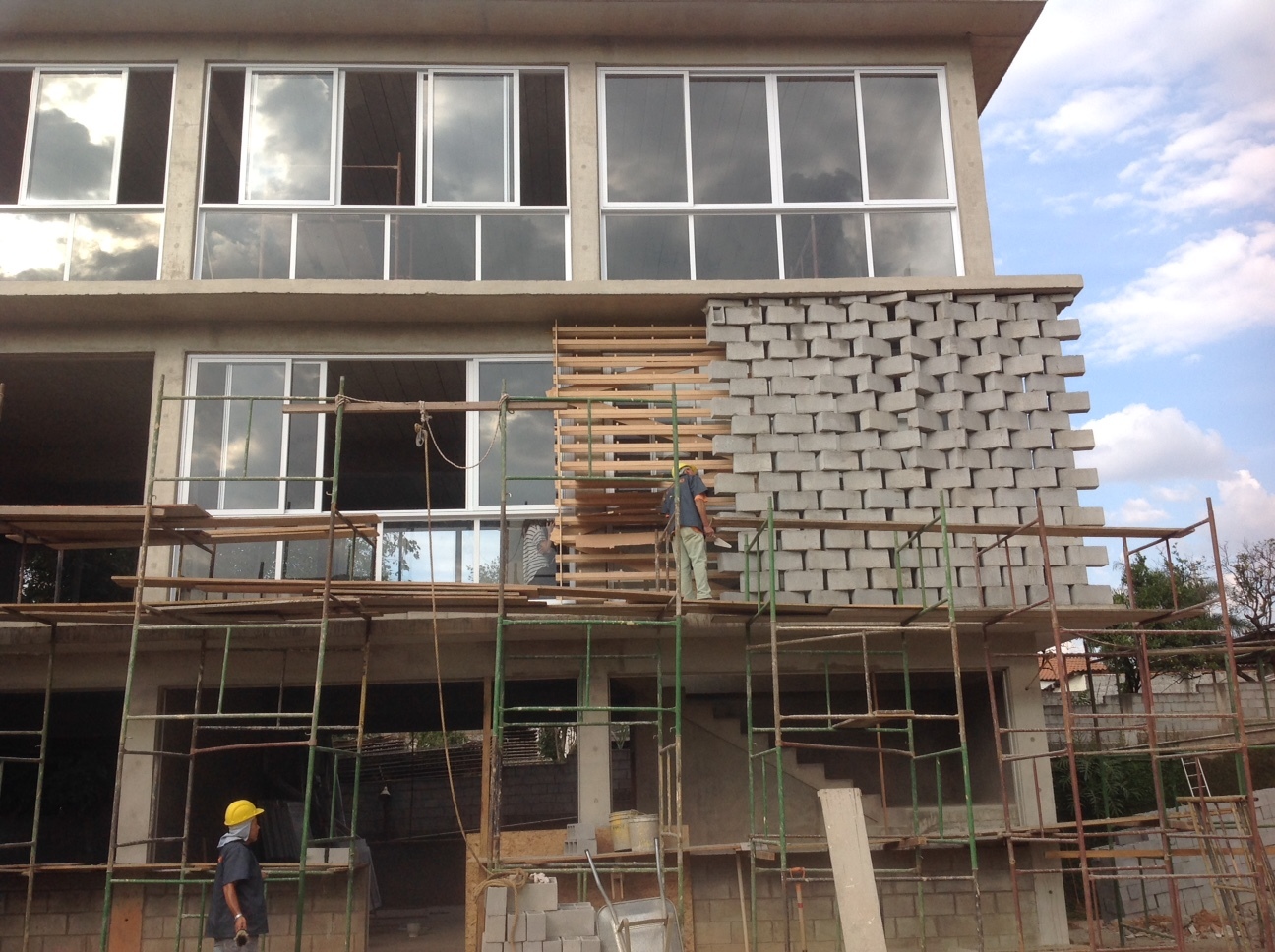 By proximity to a cargo area of trucks from the factory on the west facade of the building, a system of skin facade that would block the unpleasant sound of trucks and the excess of the afternoon sun light was thought. This facade would allow the entry of light and ventilation. Thus it was thought a simple glass facade that would be covered by a brick facade that would be arranged erratically to avoid the propagation of sound, and spaced in order to allow the environment to be illuminated properly.