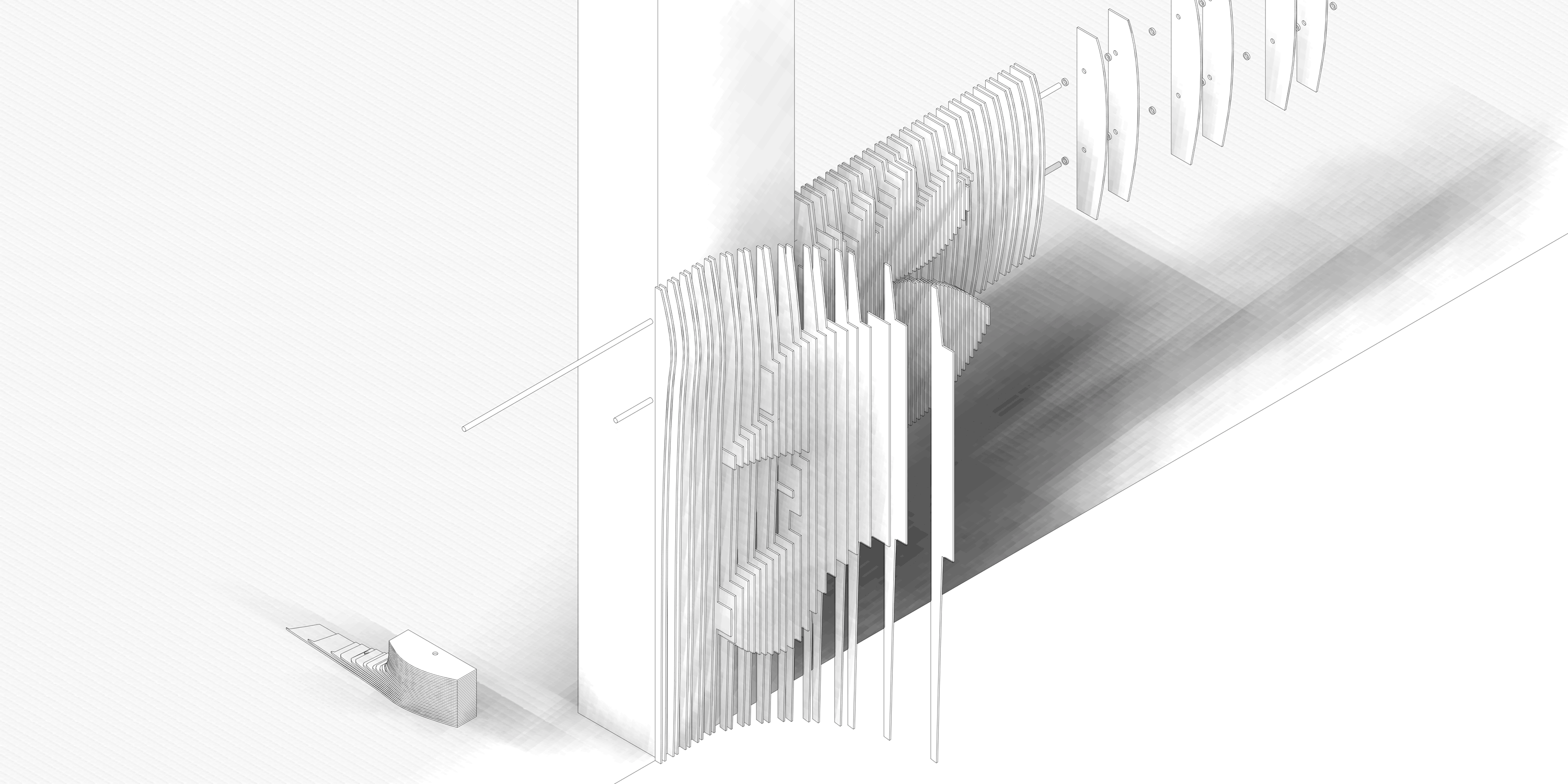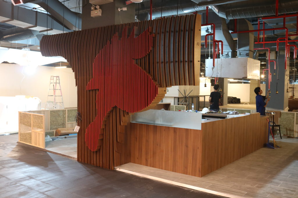 3D modeling, parametric modeling, conceptual development, prototype development, construction documentation drawings, CNC Router cutting files creation, CNC Router operation management, project and execution management of the interior of a Korean restaurant stand in a mall.
