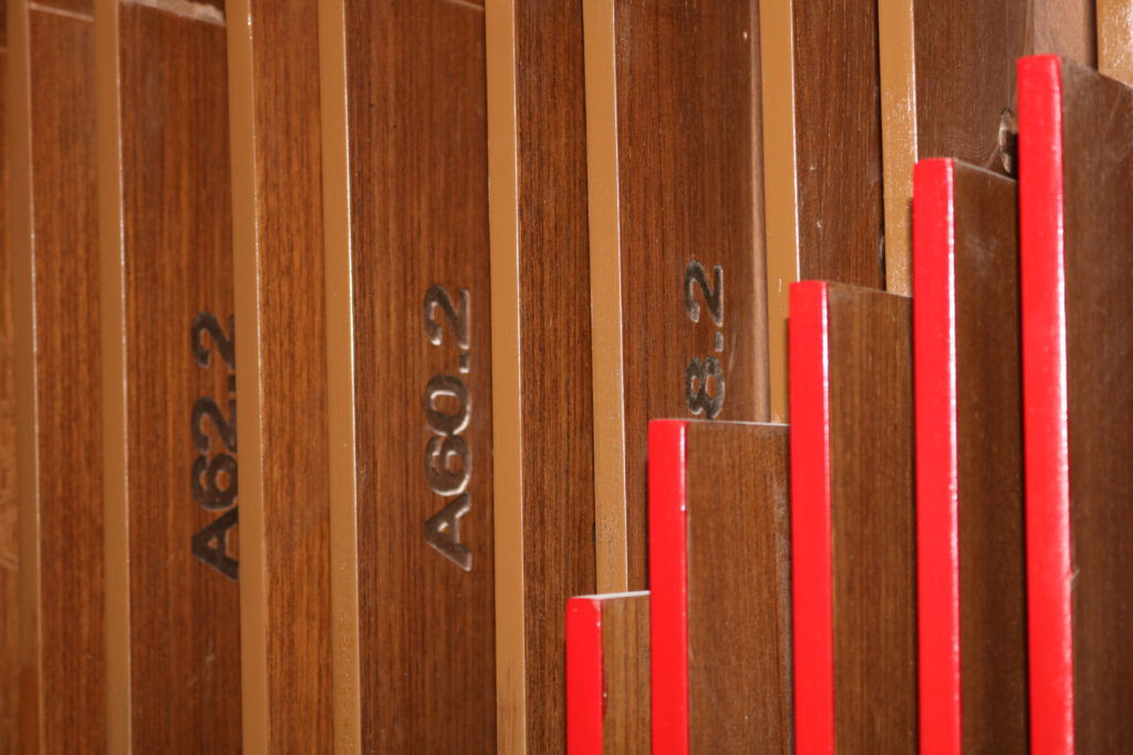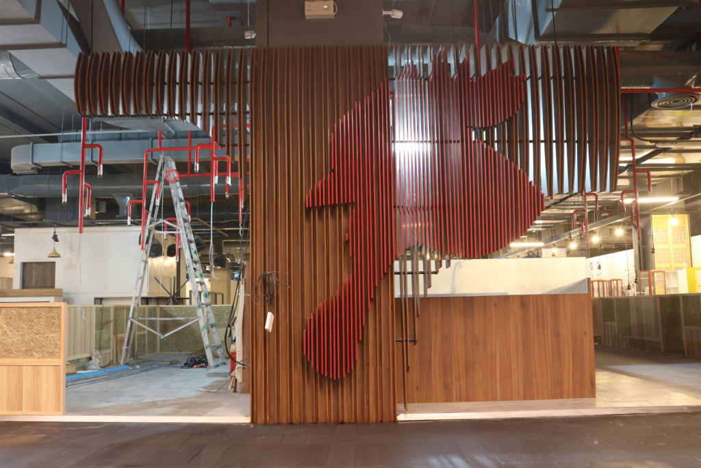 The panel was made of laminated MDF, which was cut by a CNC Router all ready with the necessary identification of the pieces, sandpapered and impermeabilized.  The detail showing the logo of the brand on the panel was later painted red, which, together with the wood laminated wood, gave an aspect of simplicity and coziness.